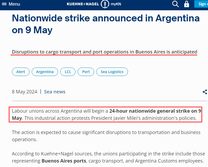Kuehne + Nagel has issued a warning on its website that trade unions across Argentina will begin a 24-hour national strike on 9 May. Cargo transport and port operations in Buenos Aires are expected to be disrupted.