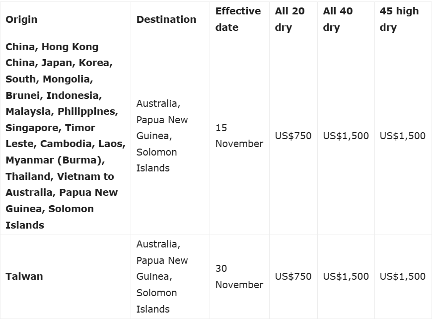 Danish box line Maersk will revise the Peak Season Surcharge (PSS) for shipments originating from China, Hong Kong, Japan, South Korea, Mongolia, Brunei, Indonesia, Malaysia, Philippines, Singapore, Timor-Leste, Cambodia, Laos, Myanmar (Bruma), Thailand, Vietnam to Australia, Papua New Guinea and the Solomon Islands.